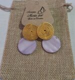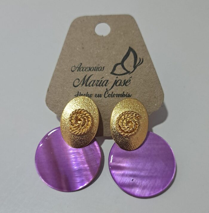 Diseño Exclusivo de Aretes Dorados con Color Lila en Material de Bronce y Nácar. Su durabilidad depende del cuidado del accesorio. No utilizar perfumes ni crema de manos.