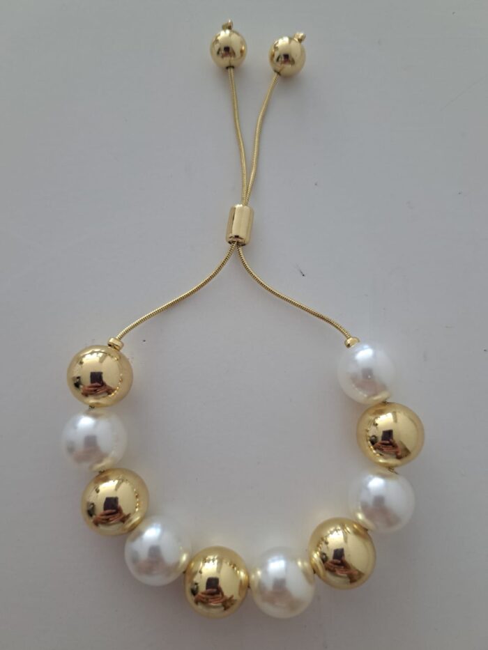 Exclusivo Diseño de Pulsera en Rodio con Balines Dorados y Perlas Grandes.