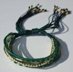 Exclusivo Diseño de Pulsera en Líneas Tonos Verdes y Dorados en Miyuki. Elaboradas a Mano. No usar lociones o químicos sobre los accesorios, podría modificar su color. No forzar los broches. Guardar en un lugar seco. No usar paños limpiadores de joyas. Se advierte que la durabilidad del producto depende del trato y la intensidad de la transpiración de cada persona.